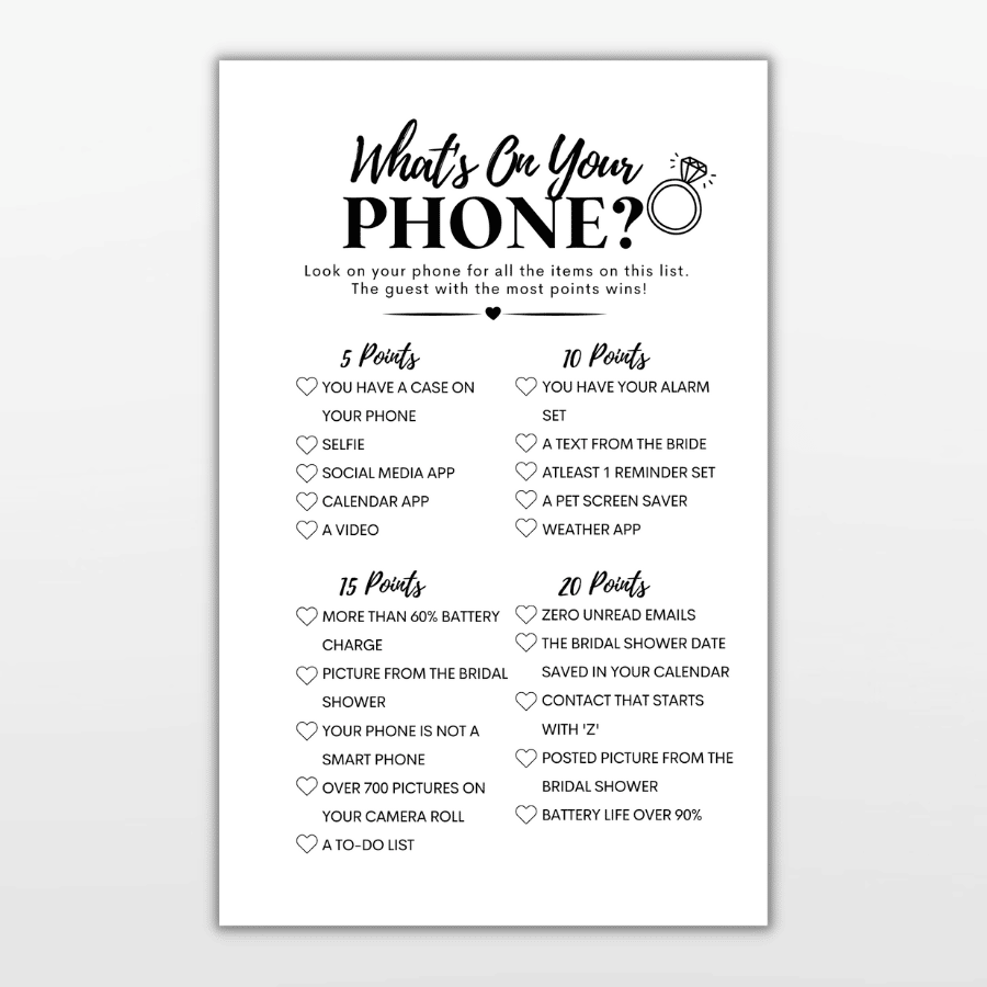 Grey What S On Your Phone Bridal Shower Game Rustic Grey Etsy Bridal Shower Planning Couple Wedding Shower Fun Bridal Shower Games